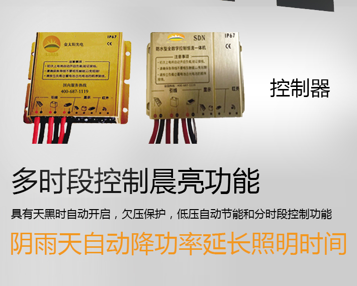 金太陽光電控制器——智能多時段控制器 ,天黑時自動開啟、欠壓保護、低壓自動節能 和分時段控制陰雨天自動降功率延長照明時間,支持遠程無線控制;